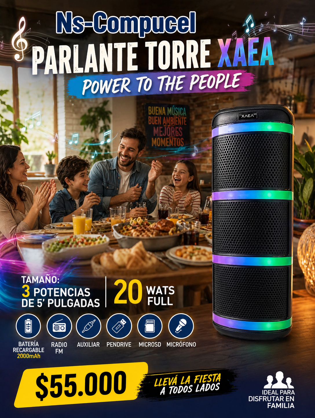 Radio FM, MicroSd, Micrófono, Auxiliar, Pendrive